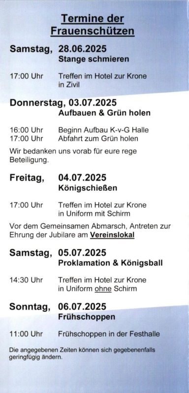 es ist wieder so weit – unser traditionelles Schützenfest steht vor der Tür! Gemeinsam wollen wir ein unvergessliches Fest voller Gemeinschaft, Musik, guter Laune und natürlich Schützentradition feiern.